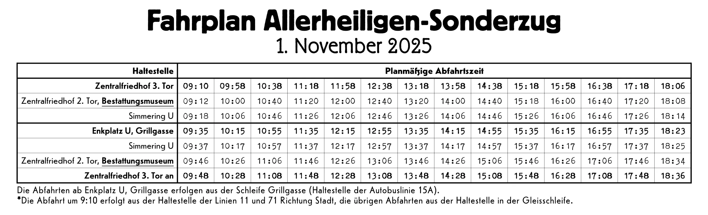 Die Abfahrten ab Enkplatz U, Grillgasse in Richtung Zentralfriedhof 3. Tor finden im 40 Minuten Intervall ab 9:35 statt. Das letzte Mal um 18:23.
